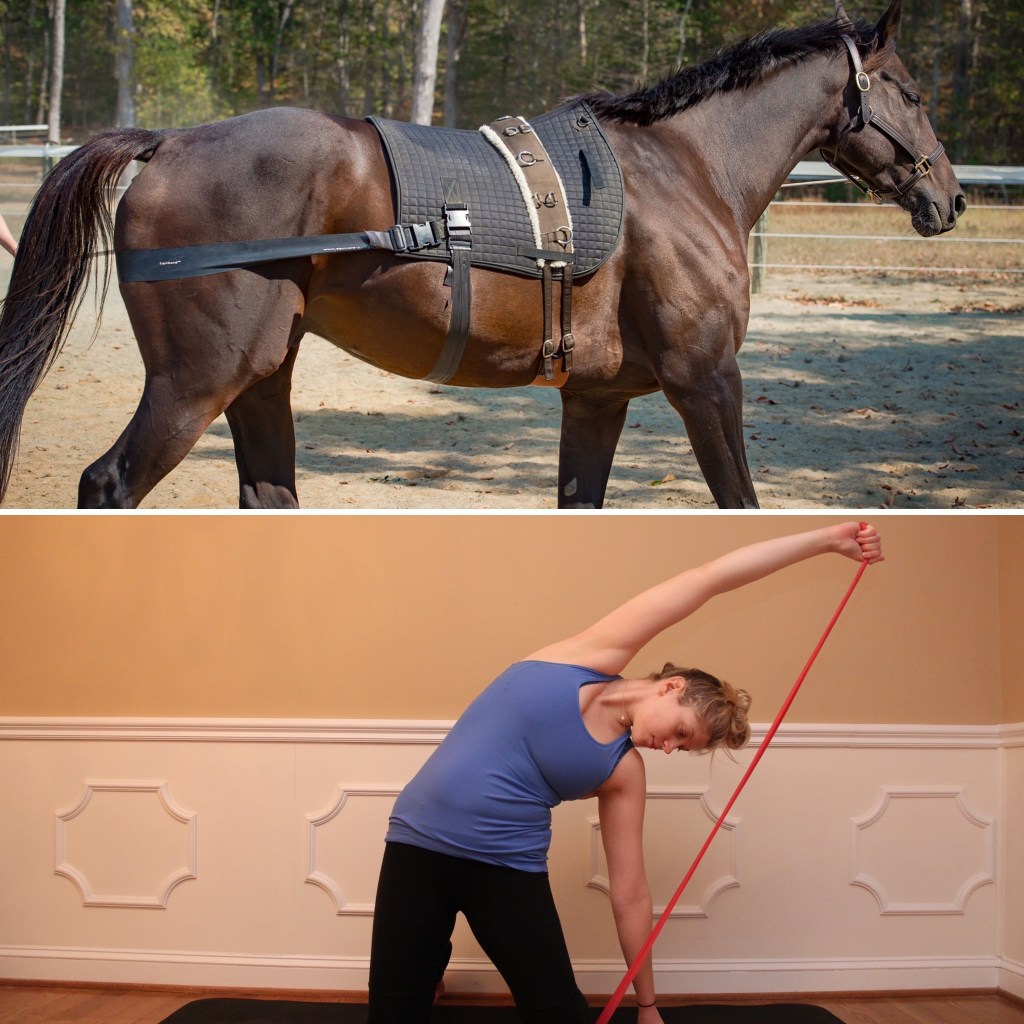 Here, you can see an example of using resistance bands to find both strength and mobility for horse and human